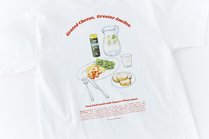 料理家・長谷川あかりさんが考案した、クラフトパルメザンチーズを使った人気レシピ「トマトチーズソースのポークソテー」をイラストのモチーフにしています。