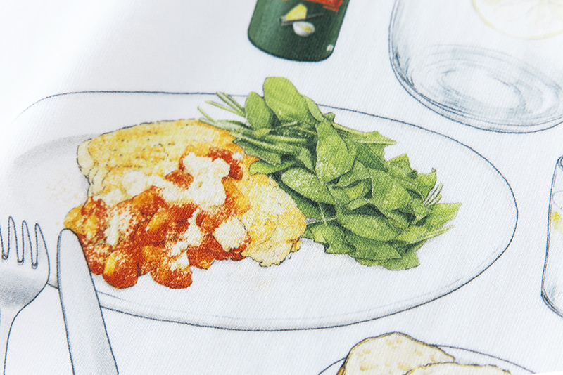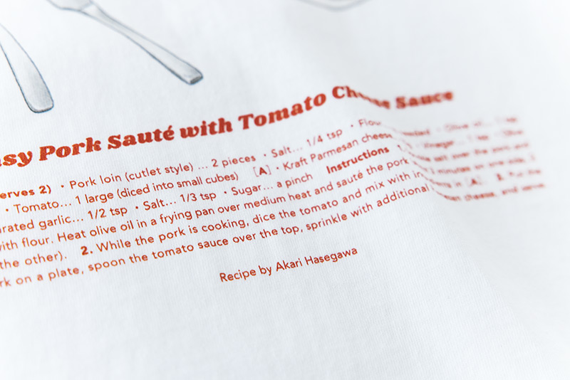 イラストの下には、実際のレシピをそのまま英文でレイアウトし、ユニークなアクセントに仕上げました。料理の魅力と遊び心を掛け合わせた、特別感のある1枚です。